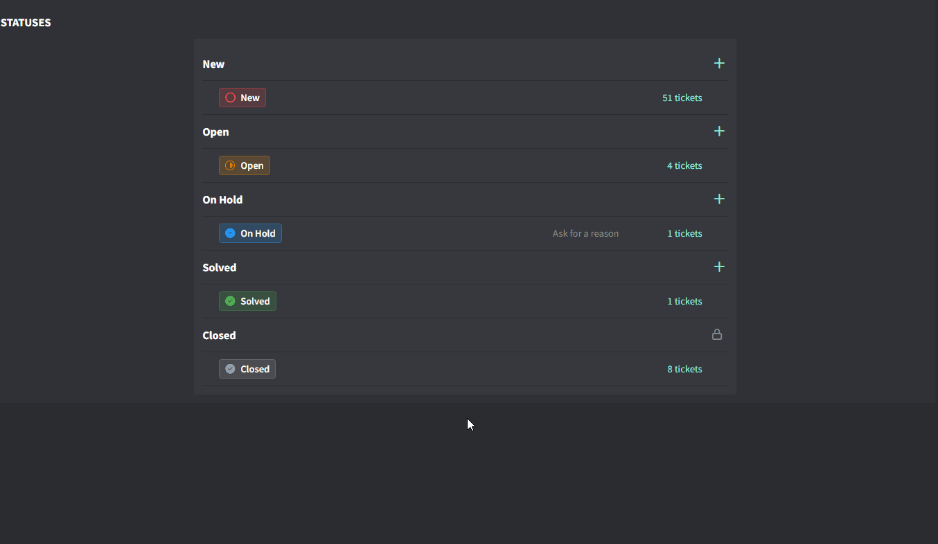 π¦ Custom ticket statuses! You can now create your own ticket statuses β set the name, color, order relative to other statuses, and even ask for a reason on status change.